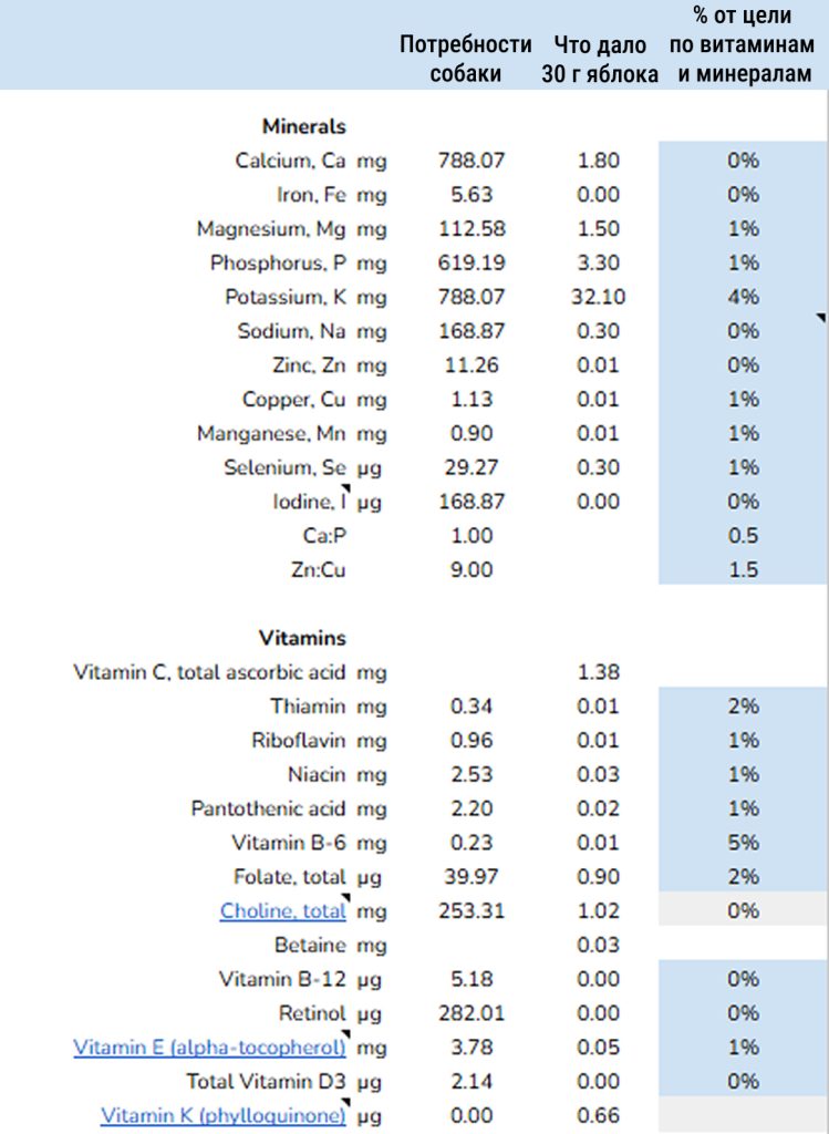 Возьмем собаку 10 кг. И дадим ей 30 г яблочка 🍏 Посмотрим, сколько витаминов и минералов она получит, если яблочко тщательно будет измельчено.