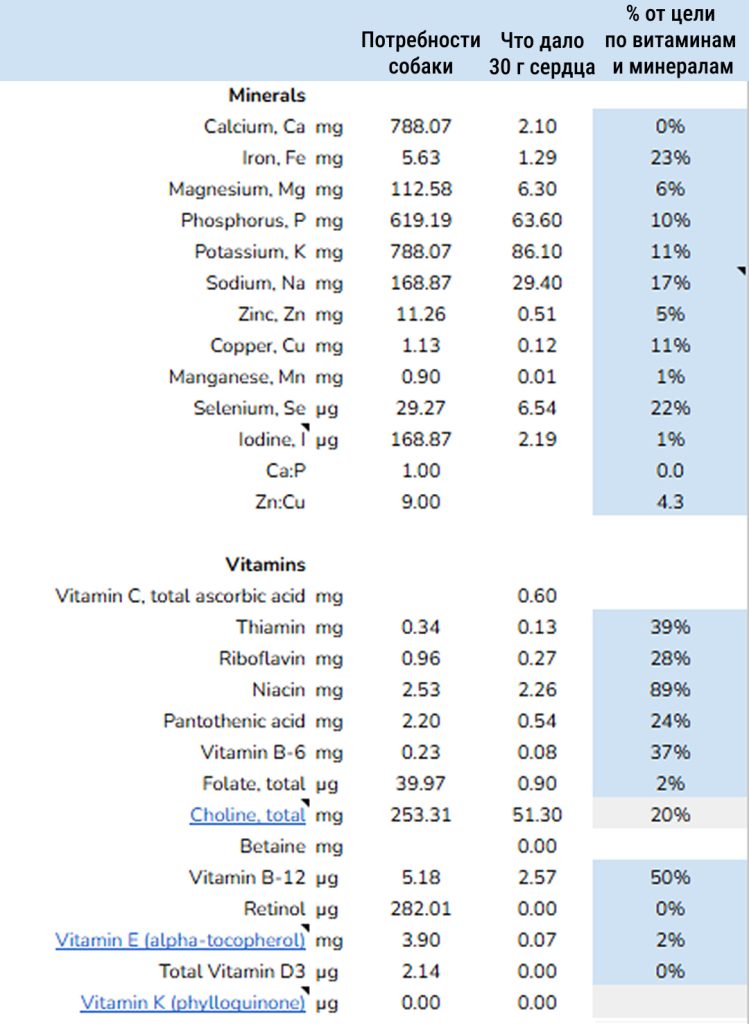 А теперь дадим нашей собачке всего 30 г говяжьего сердца. И наша собачка получит в 20 р больше вит В1, в 28 раз больше вит В2, в 89 раз больше вит В3 итд.